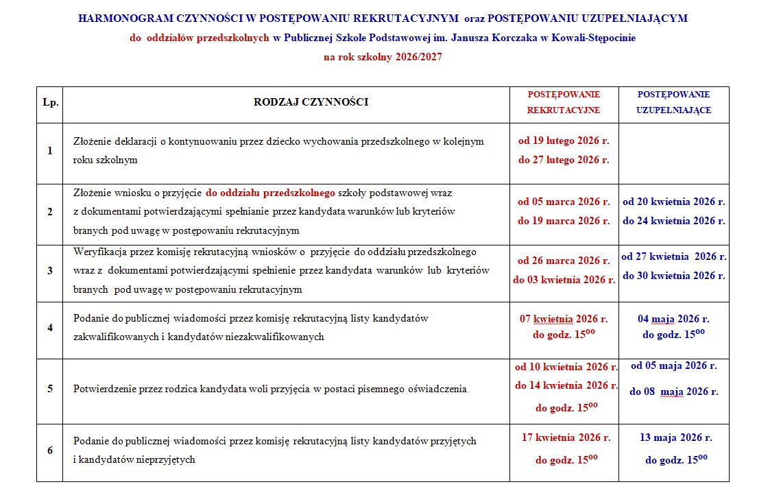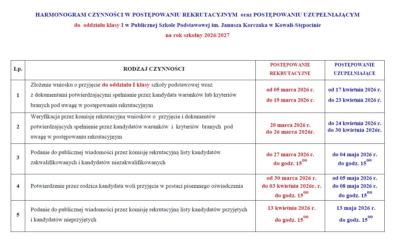 przedstawia harmonogram czynności w postępowaniu rekrutacyjnym oraz postępowaniu uzupełniającym do oddziału przedszkolnego oraz oddziału klasy I Publicznej Szkoły Podstawowej im. Janusza Korczaka w Kowali-Stępocinie na rok szkolny 2026/2027 wraz z dokumentacją rekrutacyjną do poszczególnych oddziałów: