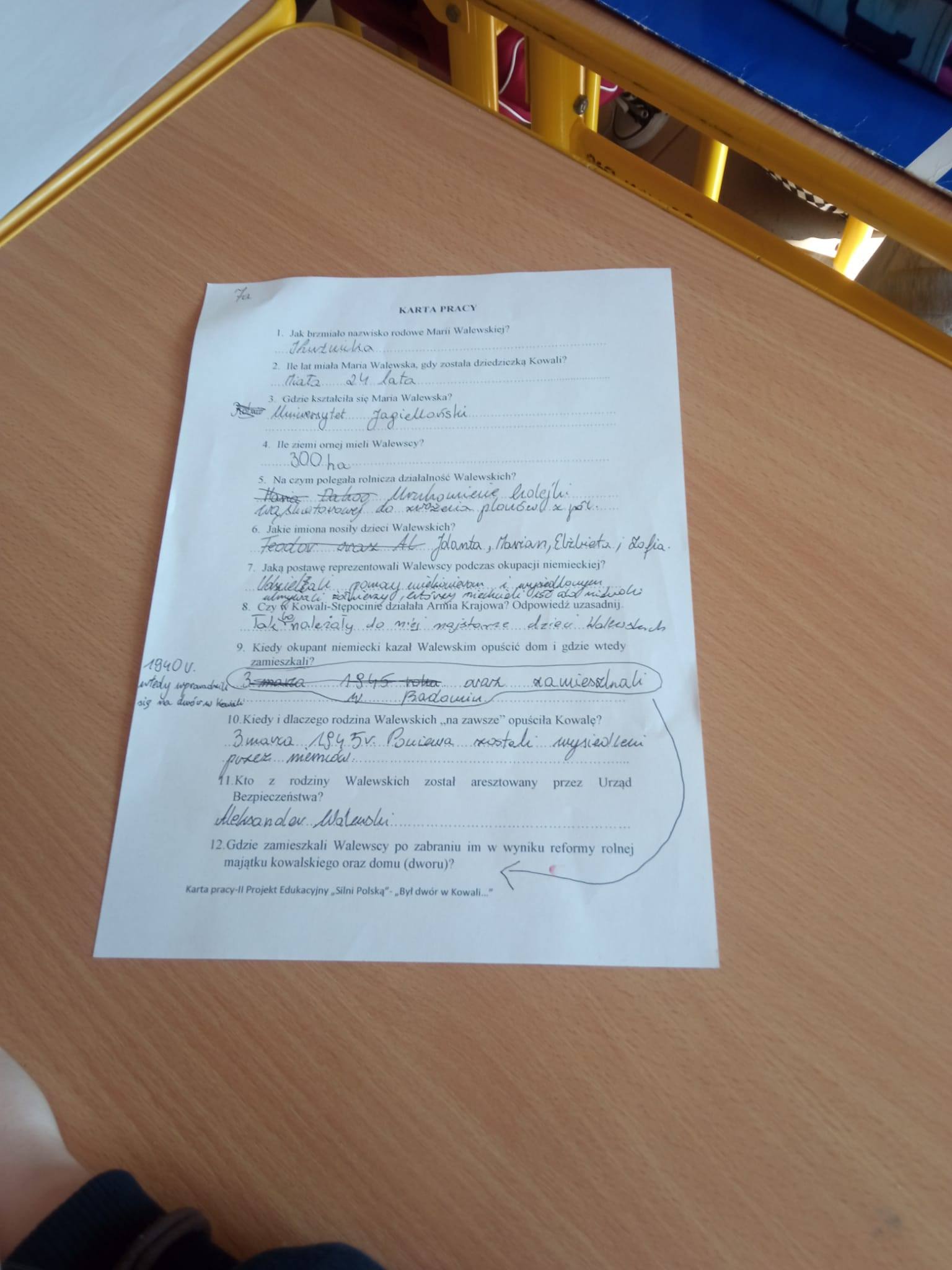 Przedmiotem warsztatów było życie i działalność ostatniej dziedziczki majątku Kowala. Uczniowie przygotowali się do zajęć poprzez zapoznanie się z życiorysem i osiągnięciami w pracy w majątku Marii Walewskiej z d. Kużnickiej. Najpierw odszukali miejsce, w którym jeszcze kilka lat po opuszczeniu majątku przez rodzinę Walewskich stał dwór ziemiański. Oznaczyli je na mapie gminy Kowala. Sporządzili dokumentację fotograficzną. Następnie pracując na materiale źródłowym, tj. zdjęciach dokumentów, drzewie genealogicznym rodu Walewskich oraz wiedzy zdobytej w trakcie realizacji projektu poprawnie wypełnili kartę pracy. Warsztaty wzbudziły u uczniów wiele pozytywnych emocji, zainteresowanie historią Kowali i ludzi, którzy ją tworzyli, chęć szukania śladów życia rodziny Walewskich w Kowali w pamięci przodków własnych rodzin.