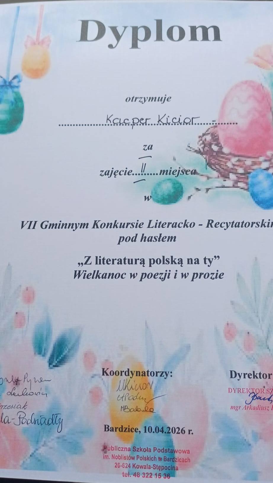 Uczeń oddziału VIIIa Kacper Kicior zdobył II miejsce w VII Gminnym Konkursie Literacko- Recytatorskim pod hasłem „Z literaturą polską na ty. Wielkanoc w poezji i w prozie”, który odbył się 10 kwietnia 2026 r. w PSP w Bardzicach.