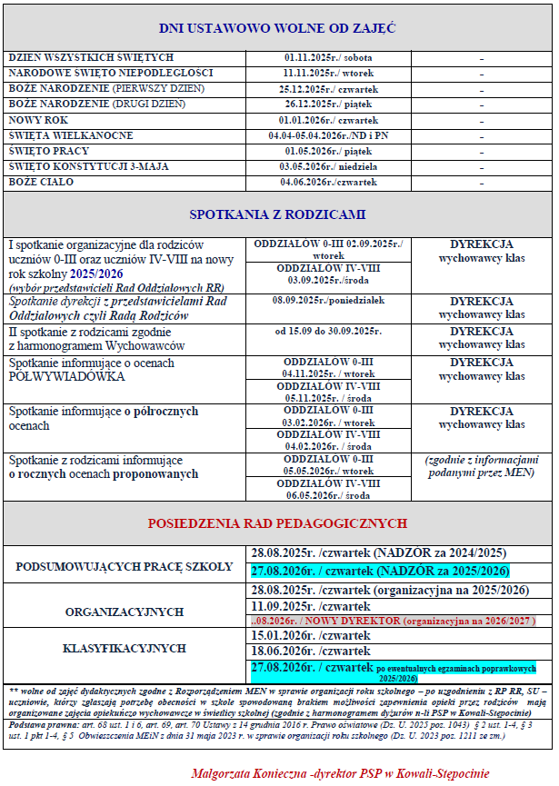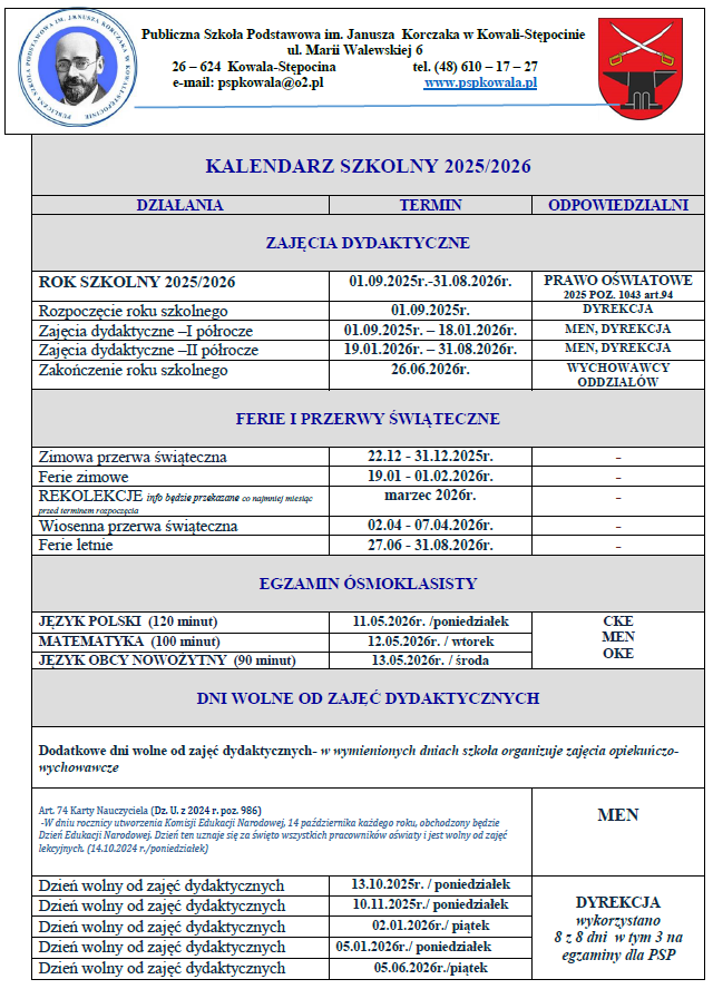 KALENDARZ SZKOLNY 2025/2026