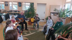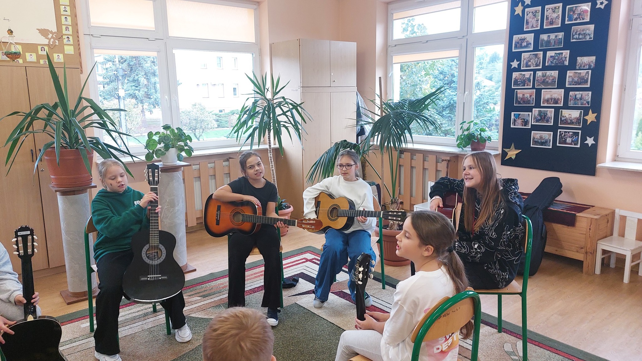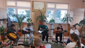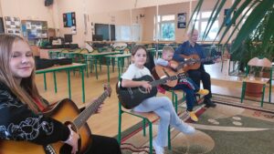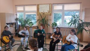 Zajęcia zespołu wokalnego z nauką gry na gitarze umożliwiają uczniom naukę gry na instrumencie. Podczas pierwszych spotkań uczestnicy uczyli się podstaw dotyczących gry takich jak proste chwyty, stroić gitarę, zmieniać struny itp. W miarę upływu czasu uczniowie ćwiczą piosenki, a w przyszłości podczas szkolnych uroczystości, będą mogli zaprezentować efekty swojej pracy. Mała liczba uczniów sprawia, że koło ma charakter kameralny i każdy ma czas by zaprezentować swoje przećwiczone umiejętności. Nauka gry na instrumencie ćwiczy cierpliwość, silną wolę, zdrowe współzawodnictwo, uczy pewności siebie i pozwala realizować swoje zainteresowania. Zajęcia skierowane są do wszystkich chętnych uczniów, którzy chcą nauczyć się grać i mają czas w czwartki o godzinie 13.30 (Sala H3). Prowadzący – Andrzej Krzyczkowski.